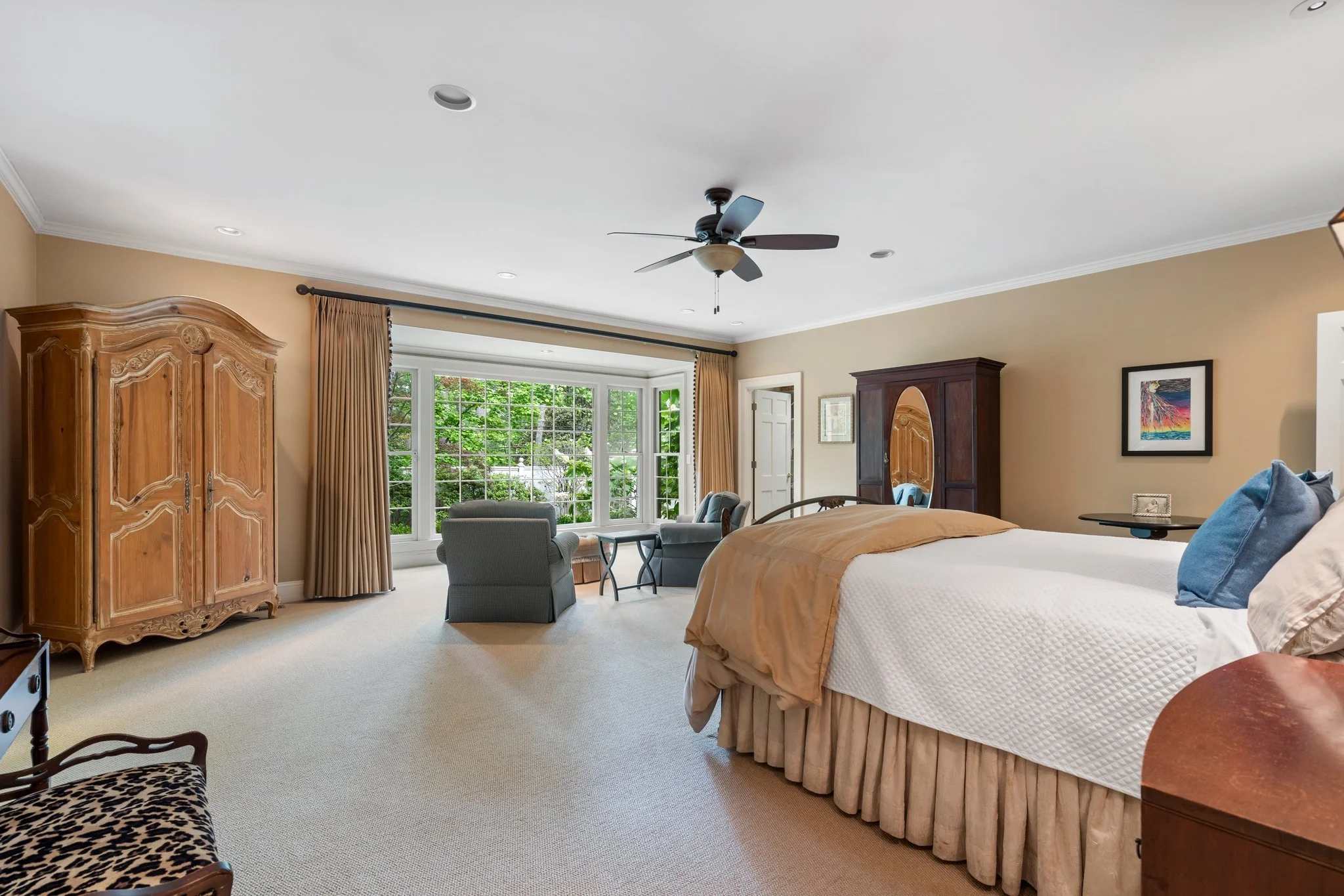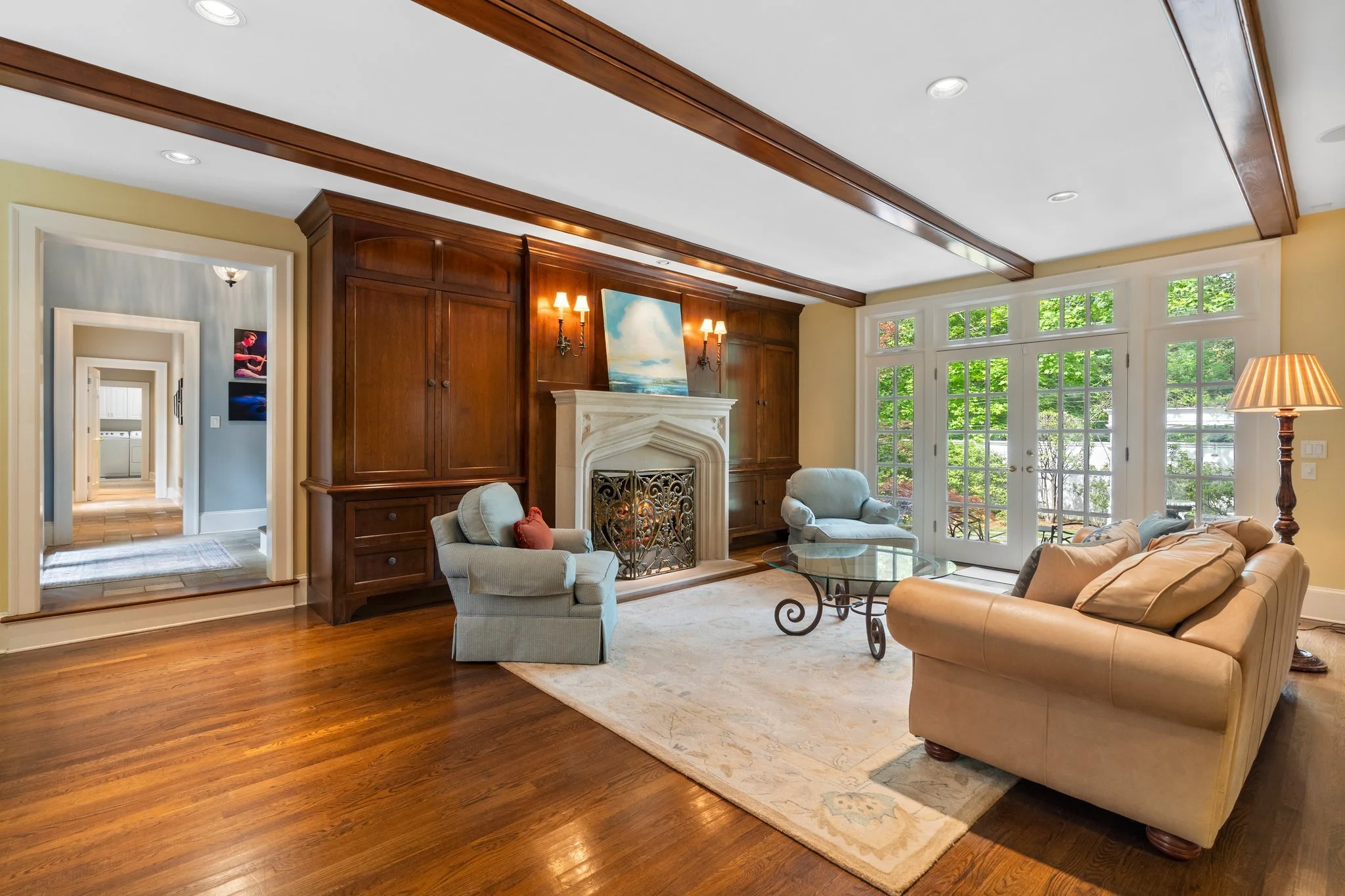 The chef’s kitchen is beautifully appointed with granite countertops, cherry cabinetry, Ann Sacks tile, Dacor double ovens, Dacor warming drawer, Viking 6-burner cooktop, two Bosch dishwashers, two Subzero refrigerator doors and a Subzero refrigerator. It opens to a light-filled family room with beamed ceilings and a custom limestone fireplace surround, plus French doors leading to the garden. Additional highlights of the home include a wonderful sunroom, wet bar, upstairs media room, large bedrooms, and easy access to good storage areas.